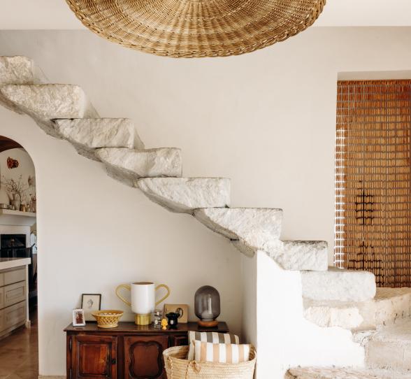 Comment donner un coup de frais à son intérieur sans casser son PEL ? La solution tient en un mot : peinture ! Trop monumental, l’escalier se fond à présent dans le décor. “On a voulu l’intégrer avec le canapé et la cheminée pour que l’ensemble soit connecté”. Quelques couches d’Ivoire pour prolonger les murs, et le tour est joué. Côté cuisine, hors de question de toucher à la structure, en parfait état. Julie a simplement troqué sa plinthe en inox pour un modèle en chêne miel, et repeint le coffrage blanc dans un brun rosé qui lui donne une nouvelle dimension. “J’ai l’impression d’avoir changé de cuisine !”