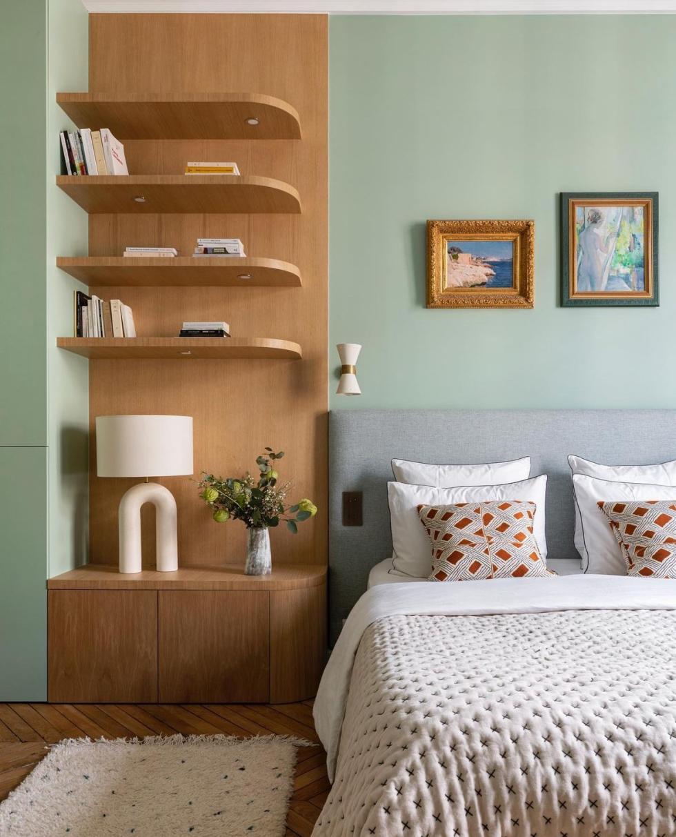 Faites bouger les lignes ! Exit la tête de lit horizontale : Vanessa Faivre a utilisé le wood panelling pour étirer les perspectives et souligner la hauteur sous plafond de cette chambre. Placé à gauche du lit, le panneau de bois sert de support à des étagères flottantes qui viennent créer du relief. De la couleur de part et d’autre, et vous combinez le meilleur des deux mondes. Qui dit mieux ?