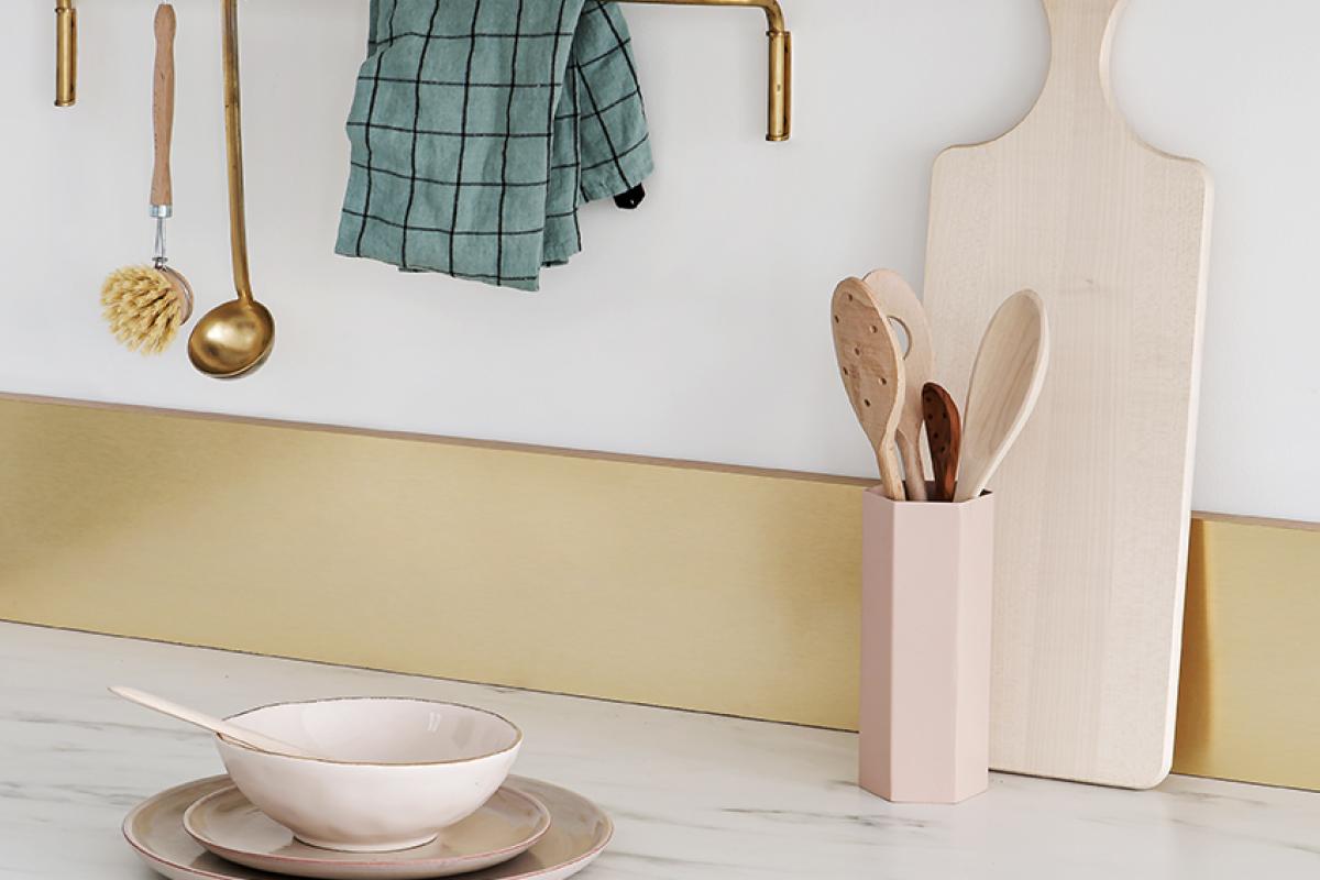 Crédence en laiton, parfaitement assortie à nos poignées et nos mitigeurs.