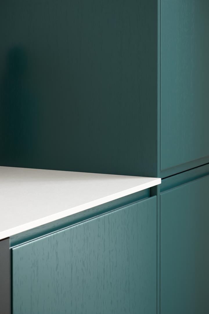 Plan de travail en compact blanc immaculé, avec un relief effet pierre. Toucher texturé.