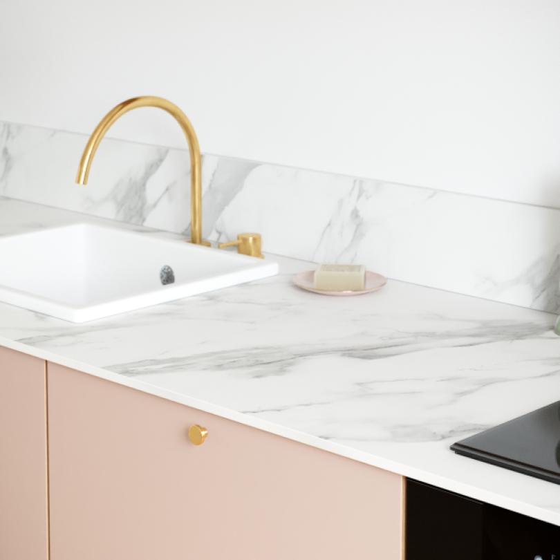 Plan de travail en compact effet marbre, avec marbrures grisées. Toucher lisse.