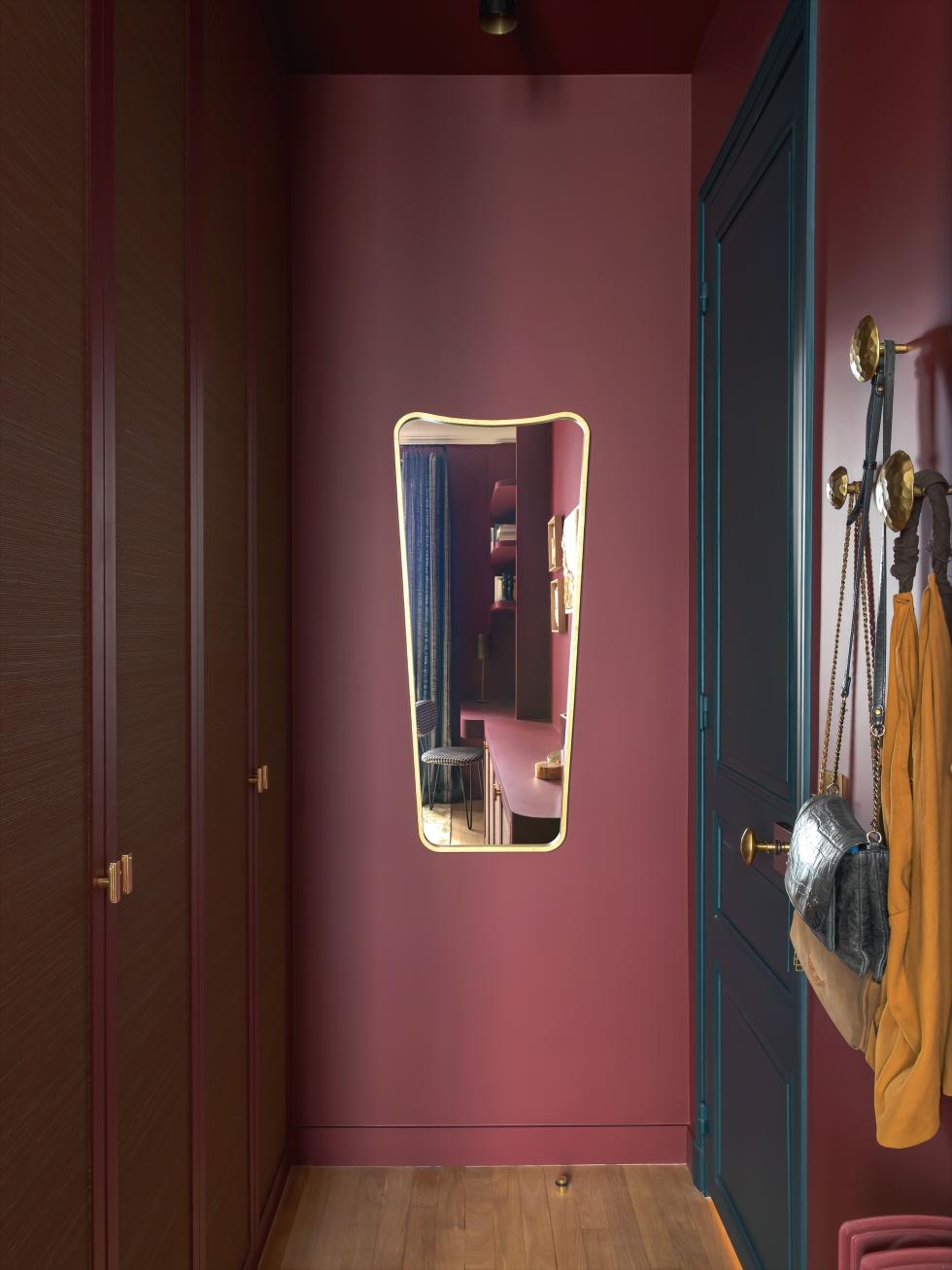 Wenn Weiß für Caroline nur eine Randnotiz ist, gilt das auch für Schwarz. Eine Gardinenstange hier, eine Wandleuchte oder eine Konsole dort, ein paar Überbleibsel aus der ersten Version der Wohnung, und das war es. Die Gründerin von Atelier CVD bevorzugt tiefe Farbtöne wie Petrolblau oder Weinrot, die sie als Akzente einsetzt, mal um einem Fenster Charakter zu verleihen, mal um einer Glaswand eine verspielte Note zu geben. Ihre einzige Regel ist, dass jeder Farbton aus der Tapetenpalette des Wohnzimmers stammen muss, um eine perfekte Harmonie aller Farben sicherzustellen.