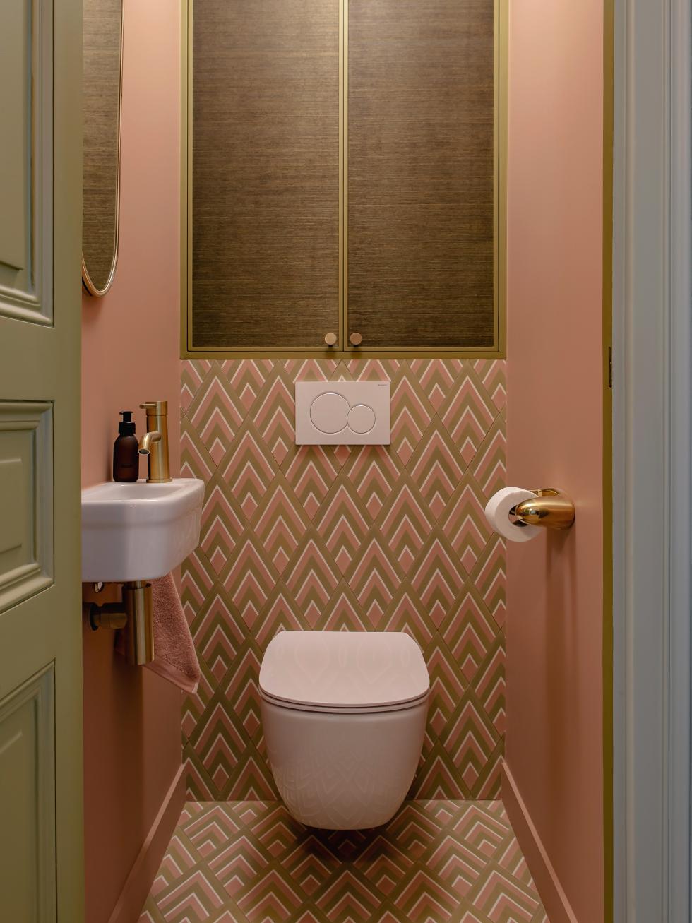 Tapeten von Pierre Frey, eingerahmt von einem Spiegel in gebranntem Erdfarbton, celadongrüne Wände und trennende Glaswände in Petrolblau. Der Eingangsbereich setzt ohne Umschweife den Ton. Selbst das versteckte Gäste-WC mit bronzener Tür und zartrosa Fliesen scheut sich nicht vor Farbe. Tatsächlich war es genau dieser kleine Raum, der die Idee für ein zweites Leben der Wohnung entfachte. „Ich hatte gerade die Wohnung meiner Nachbarn über mir renoviert und festgestellt, dass wir auch ein zweites Badezimmer schaffen könnten, ein Muss, wenn man mit drei Teenagern zusammenlebt.“ Ein perfekter Anlass für Caroline, sich kopfüber in ihre Sehnsucht nach Veränderung zu stürzen. Weg sind die makellosen Wände, das reine Weiß der Holzarbeiten und die schwarz-weißen Sofas. „Mir wurde klar, dass mich Farbe glücklich macht."