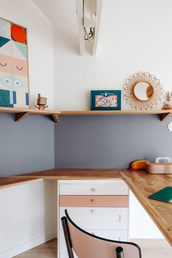 Doppelbett, Schreibtisch in Erwachsenengröße und ein Kleiderschrank, der Pax und Metod Elemente kombiniert... Lassen Sie sich nicht täuschen: Mélanies jüngste Tochter ist erst 5 Jahre alt! "Wenn man das Babybett aufgibt, empfehle ich immer, auf ein Doppelbett umzusteigen: es ist super praktisch im Alltag, es hilft aus, wenn man Gäste hat, und man muss es in ein paar Jahren nicht wieder wechseln!" Diese Philosophie gilt auch für den Schreibtisch. Mit seiner Standardhöhe und den zweifarbigen Aufbewahrungsfächern dient er als kreativer Raum, bis die Hausaufgabenzeit kommt.