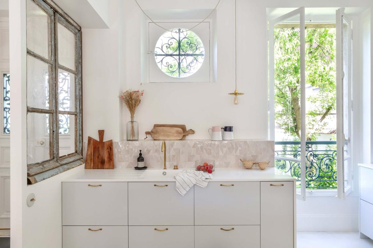 Oft kann eine kleine Veränderung schon so viel verändern. In diesem Fall genügte ein Raumtrenner mit skulpturalen Ausschnitten, damit der Architekt Camille Bernard dieser Küche in “Amandier grisé” eine außergewöhnliche Dimension verleihen konnte. Die aus hellem Holz gefertigte Wand korrespondiert perfekt mit den natürlichen Materialien, die man von den hohen Türen im Rattan-Design bis zum Fliesenspiegel wiederfindet. Die kleine Wand unter dem Holzkonstrukt, die in derselben Farbe wie die Möbel gestrichen ist, vervollständigt dieses harmonische Ensemble. Très chic!