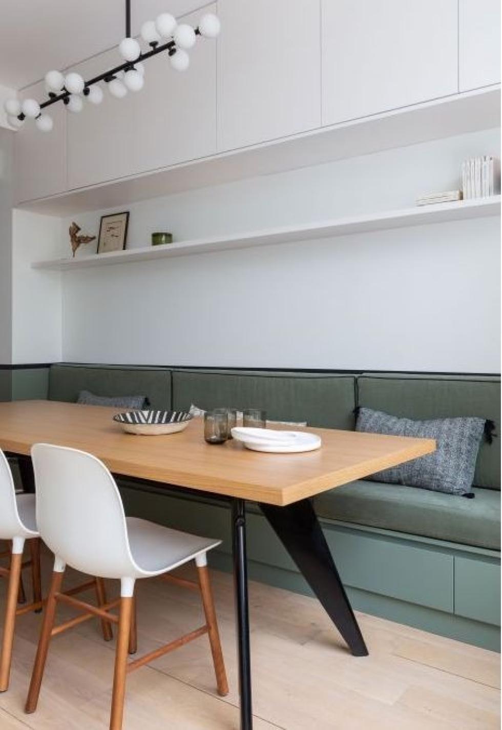 Ein Tisch, zwei Stühle und drei Metod-Korpusse, die als Sitzbank dienen: Die von der Innenarchitektin Alexandra Offe entworfene Essecke vereint Stil und Effizienz. Hier kommt es auf die Details an. Die Sitzfläche der Stühle greift unsere glatten mattlackierten Fronten in “Grün 02 - Sombre forest” auf, die als Verkleidung für die Sitzbank gewählt wurde. Der Bogen nimmt die Farbe der Unterbauten auf und verleiht dem Raum eine angenehme Dimension, während die natürlichen Holzakzente die verschiedenen Elemente miteinander verbinden.