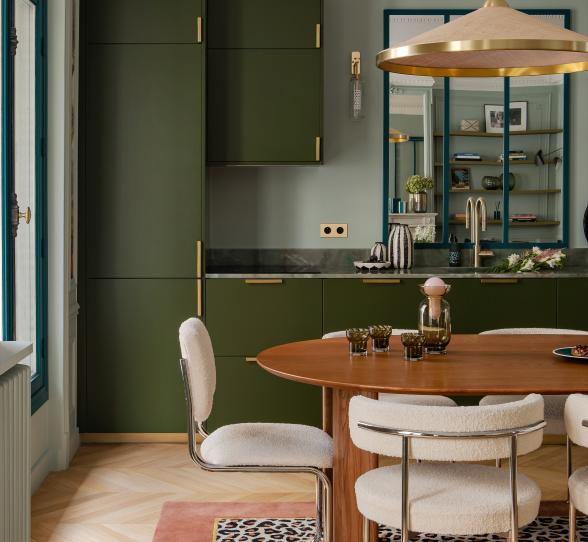 Ein Bonbon von Boden bis Decke! Wie eine kubische Einheit gestaltet, wird Fanny Petits Sorbet-Küche durch eine Wandfarbe von Ressource, die dem Ton unserer lackierten Fronten nahekommt, perfekt ergänzt. Der ehemalige Müllschacht, gefliest in drei verschiedenen Nuancen, verleiht dem Ganzen einen originellen Akzent.