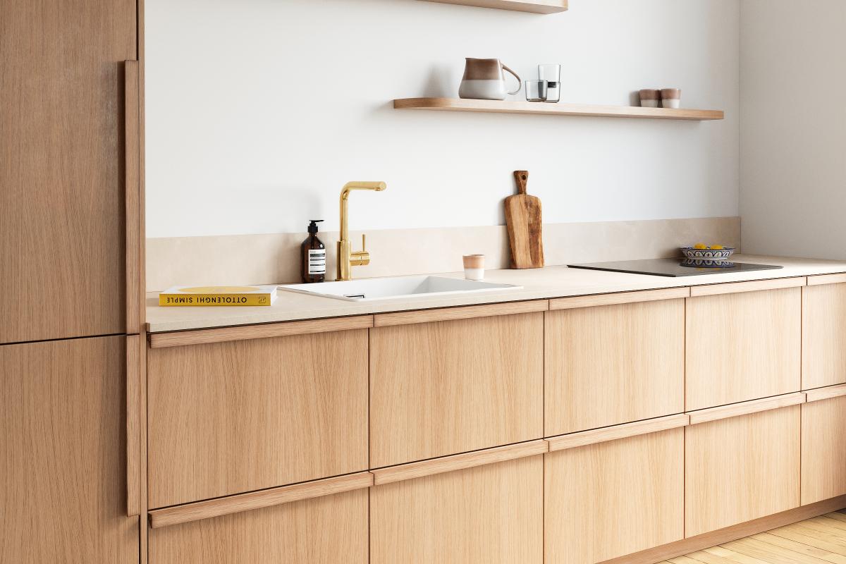 Griff aus massivem Eichenholz, vertikal oder horizontal anzubringen, um grafische Linienmuster zu schaffen. Goldene Honigfarbe. Erhältlich in 6 Größen.