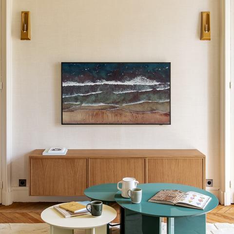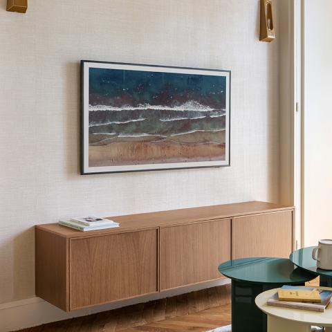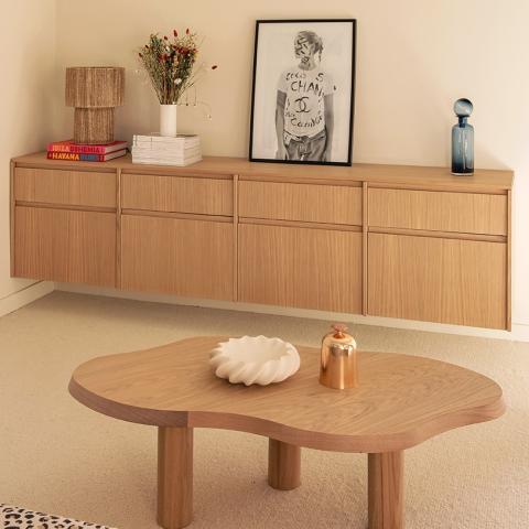 Cette enfilade suspendue en Chêne naturel structure la pièce avec légèreté.