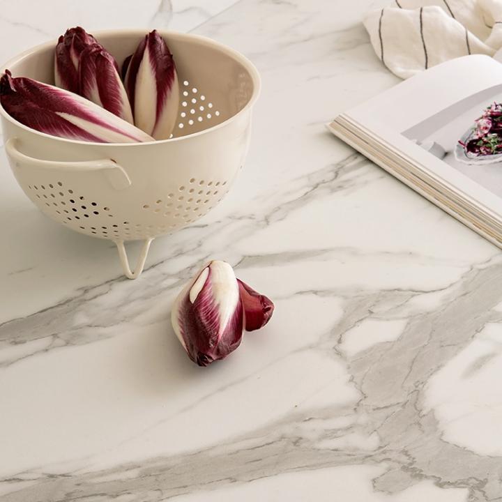 Échantillon de plan de travail bi-face en stratifié, Marbre d'Automne et Marbre Calacatta.