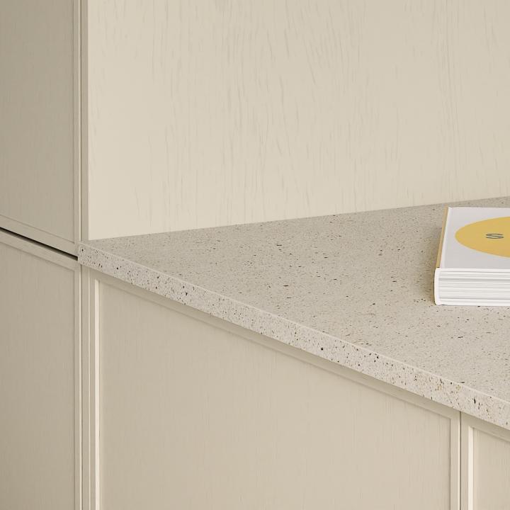Crédence en stratifié gris chaud, représentant des petits cailloux gris et noirs incrustés de façon irrégulière. Toucher texturé légèrement rugueux, effet béton.