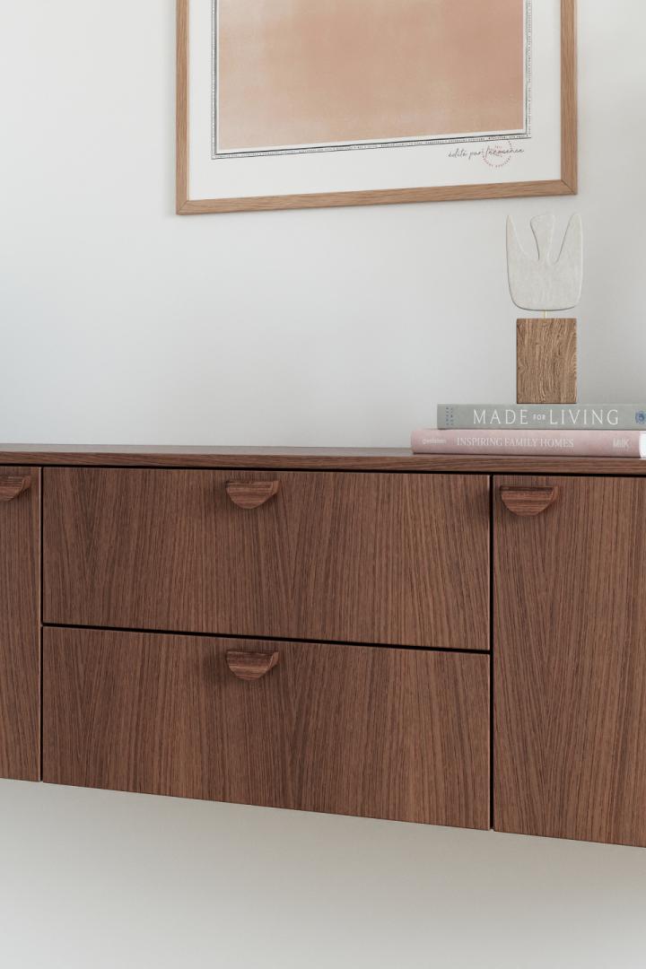 Poignée en noyer massif. Avec sa forme de demi-lune, elle se place aussi bien à l’horizontale qu’à la verticale pour créer des jeux de lignes sur vos façades. Disponible en 5 tailles.