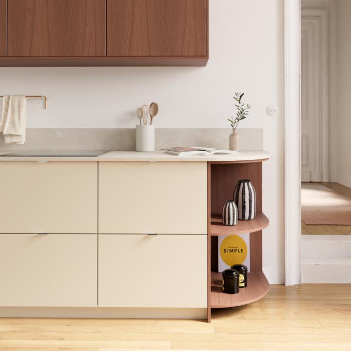 Open rounded unit with integrated legs, compatible with Ikea Metod dimensions. To be paired with our rounded worktops.