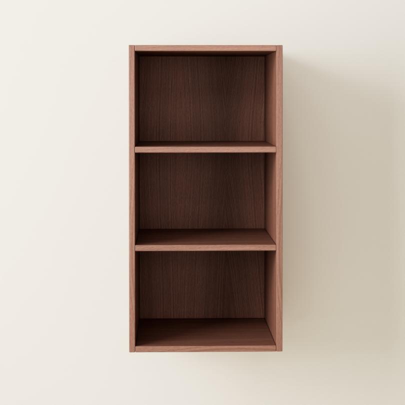 Open cabinet to hang from the wall, using a strut. Strut and brackets provided. The height of the shelves is fixed.