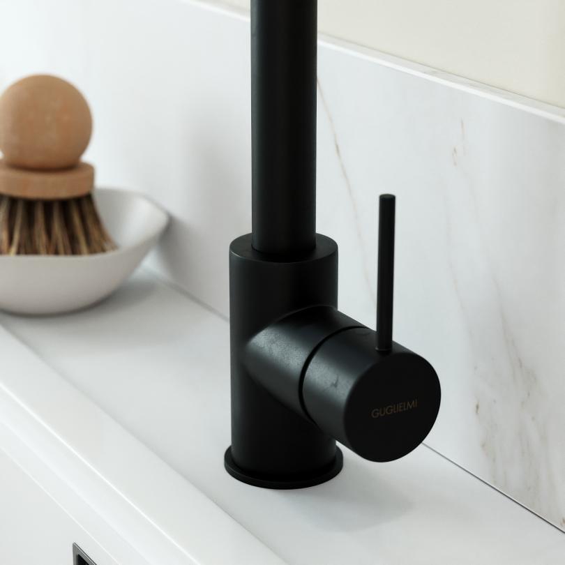 Solid brass kitchen tap with pull-out spray, matte black finish.