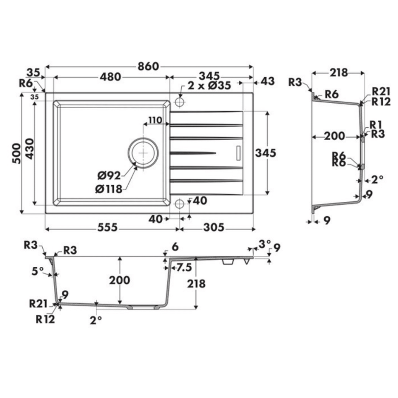 Width: 86cm. Depth: 50cm. Bowl depth: 20cm. Minimum cabinet width: 60cm. Weight: 16.38 kg.